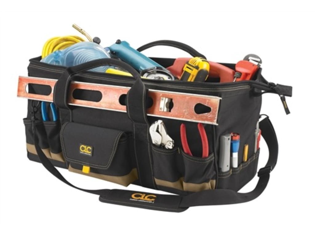 8 Multi-use pockets inside and 24 outside organize tools and accessories Internal metal frame holds the bag open for easy access Large interior to carry power tools, circular saws, hard hats, etc. Padded handles and adjustable shoulder strap 24"L x 11"W x 12"H