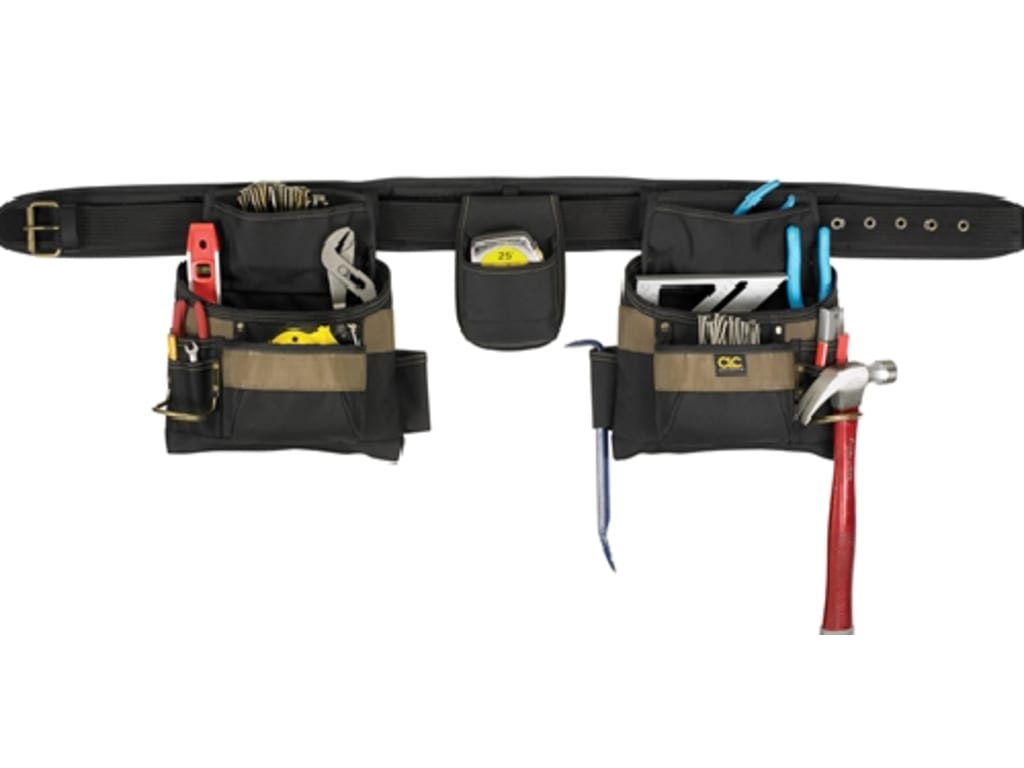 Made of 600D polyester fabric and 1680D ballistic nylon binding. 6 main nail and tool pockets and 11 smaller pockets for pliers, pencils, nail sets, two-way radio, etc. Padded comfort belt with double adjustment fits waists 29"-52".