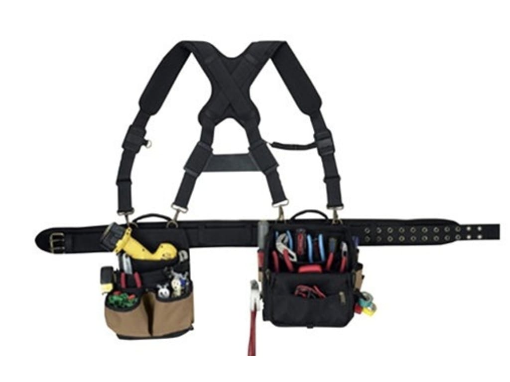 Unique, padded suspenders are engineered to carry loads comfortably and distribute weight evenly without strain on the lower back and hips. Easy Carry Handle design provides for simple adjustments and easy storage without spilling contents. Patent #6,179,185 Zippered top flap pouch to prevent spillage of tools when not in use. Built-in cordless drill pocket. 3” Wide padded comfort belt with double tongue steel roller buckle fits waist sizes 29”– 46”. Tape strap, tool snap, and metal hammer holder