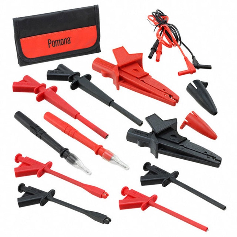 Pomona 5904A/POM is a Deluxe Electrical DMM Test Lead Kit. Test leads with a right-angle banana plug are ideal for use with a hand-held digital multimeter. Flexible test leads feature high strand count silicone wire for extreme flexibility and high-temperature resistance. Wear indication with double insulated (dual extruded) silicone leads shows a white inner layer for increased safety. Banana plugs are molded directly to the wire for superior pull strength. A modular probe design allows probes, alligators, and grabbers to fit directly onto the test leads for testing versatility.