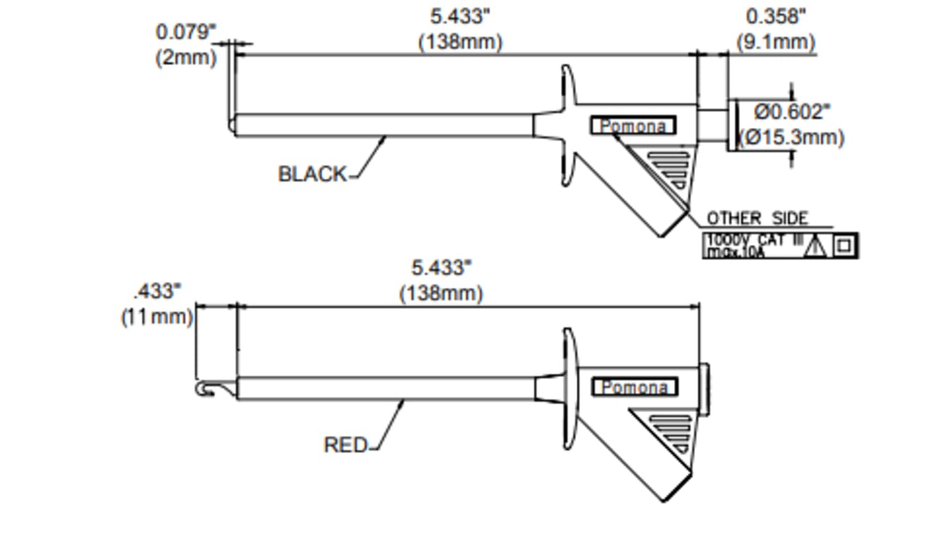 Maxigrabber® test clip has been redesigned to meet IEC 1010-2-31. This is the latest international safety standard for test accessories. The long shaft is ideal for electronic, electrical, and industrial applications where access to hard-to-reach high voltage test points is a requirement. The Tip Guard is Stainless Steel for tip durability. Safety sheathed jack mates to Pomona’s 5907A, 5908A, and 5909A Flexible Test Leads for Digital Multi-Meter interfacing.