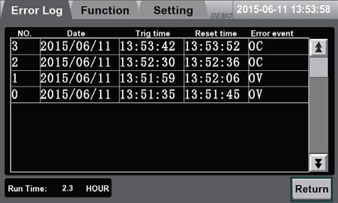 ADG series’ touch screen has the built-in event log function that allows users to view error history. This helps user to keep track on the power supply’s operation and better analyze the test results.