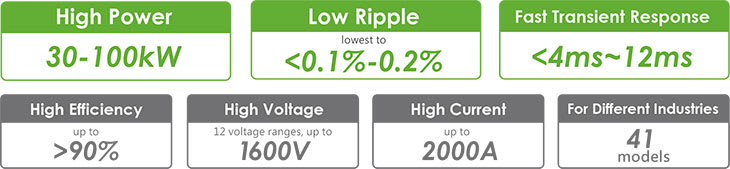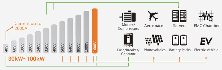 ADG series has many output voltage ranges suitable for different market applications. Models over 640V output voltage are applicable for renewable energy, EV, and lithium battery industries. When it comes to circuit breakers, contactors or fuses that require high voltage or current, models with 2000A or 1600V can fulfill the power demands of this type of component testing. The 400V or 320V models can be applied to server related applications due to the increased needs for high voltage DC in data centers.