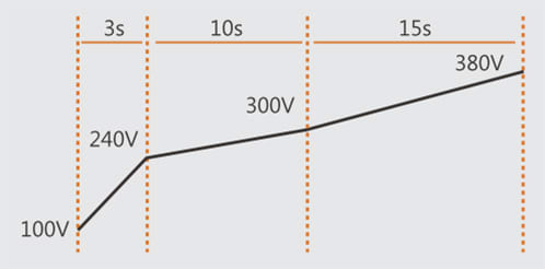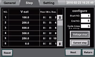 The built-in STEP and GRADUAL modes allow users to set up sequences of start / end voltage, run time and current for different testing simulations. Or users can contact us to customize different built-in voltage and current simulations for easy testing set up.