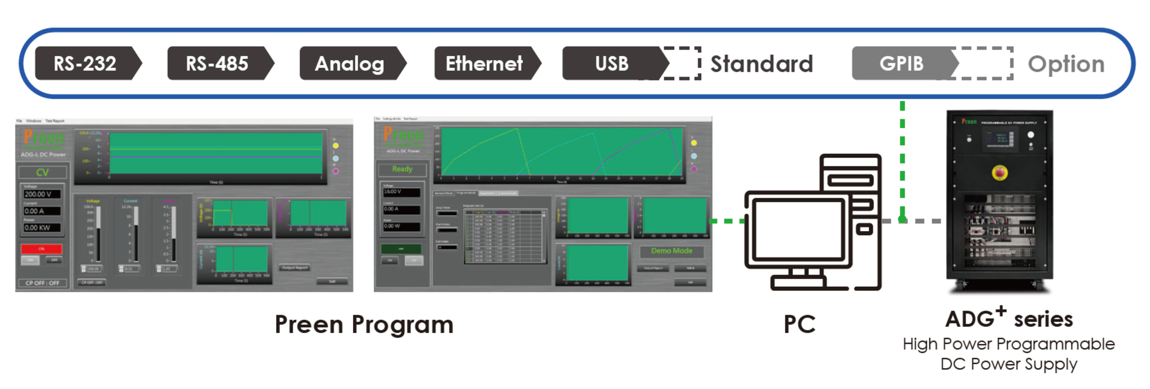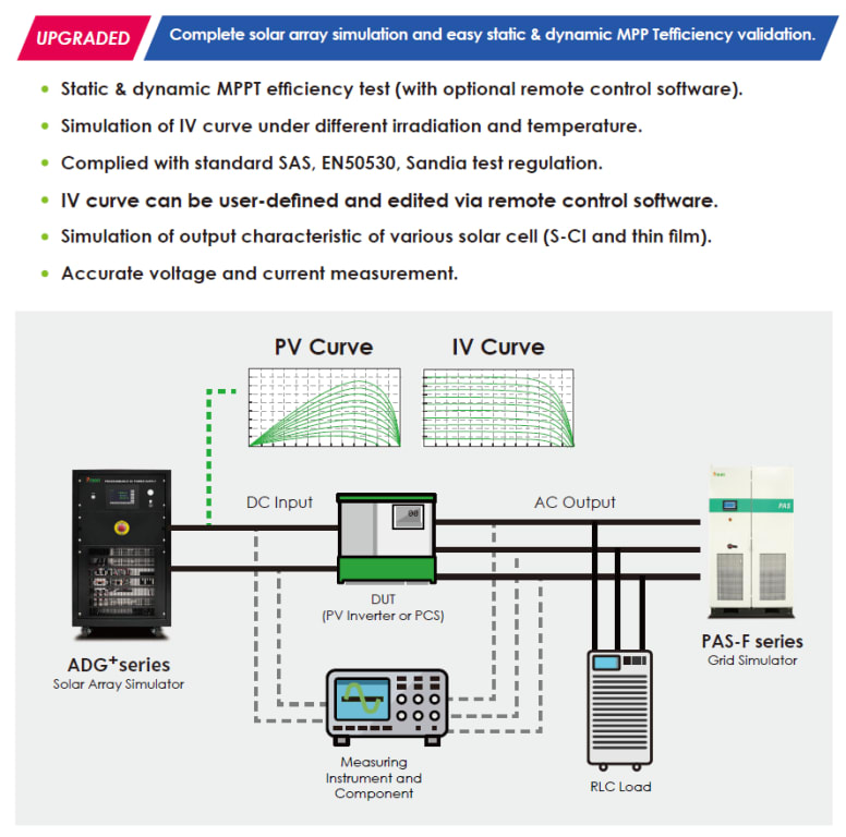 As a unique high-power single-unit programmable DC power supply, the ADG+ series has a wide range of output voltage and current, which reach up to 2000V and 2500A continuously adjustable. Its single-unit output is up to 300kW and provides customized parallel operation to expand capacity up to 1800kW. It features high power with excellent programming function, fast response, and high stability. For the communication interface, it has standard RS-485, RS-232, Ethernet, Analog Control, USB, and optional GPIB. The STEP & RAMP modes allow easy setup on the test sequence and depending on CV/CC/CP settings and load conditions, the ADG+ series can operate as a current or voltage source.