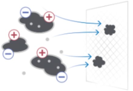 Airborne particles are charged by the ions causing them to cluster and be caught in filters