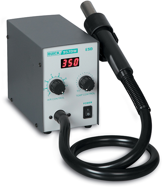The Quick 957DW+ is a 580 watt hot air station. The 957DW+ has two knobs on its front panel for adjusting temperature and airflow, and an easy to read LED screen displaying the current temperature. It has a maximum airflow of 100 L / min, and a maximum temperature of approximately 840°F. The 957DW+ has a sensor inside the handle which activates the station when the handle is picked up. This makes the station easier to use, and along with auto cooling, also prolongs the life of the heater.