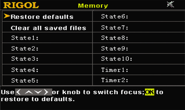 | It supports storing and recalling state files and timer files, and allows you to restore the instrument settings to defaults. |