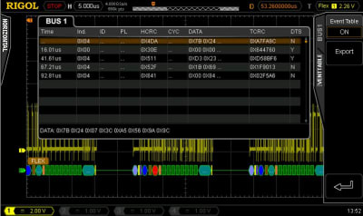 8. Decoding Table The decoding table lists the decoded data, the corresponding time and error information in table format. It can be used to observe relatively longer decoded data to solve the problem that some data could not be seen clearly on the screen. Press Event Table → Event Table to select “ON” (note that this operation is only available when BusStatus is set to “ON”) to enter the decoding table interface as shown in the figure below. If an USB storage device is currently connected to the instrument, press Export to export the data table to the external USB storage device in CSV format.