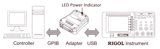 Connect the USB interface of the adapter to the USB Host interface of the Rigol instrument and connect the GPIB interface of the adapter to the GPIB controller.