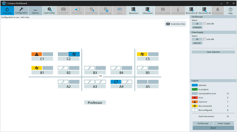 Teaching large student groups in test and measurement laboratories can be difficult to manage. Especially in laboratories with many workbenches and different instruments, it is cumbersome to provide identical conditions for all students. Retrieving results from all students’ instruments usually is a time-consuming task. At the same time, it is necessary to keep all instruments up-to-date with regular firmware updates. With the R&S CDS software, these tasks can be performed for multiple instruments simultaneously. It enables simple and time-efficient teaching of large student groups in laboratories with multiple test and measurement benches. Operated from one central computer, the software automatically connects to supported instruments in the local network. It makes it possible to arrange the instruments on virtual benches that can be customized to match the user’s laboratory layout. The software also enables simultaneous firmware updates on multiple instruments with just a few clicks. The R&S CDS campus dashboard software remotely controls up to 300 individual instruments (oscilloscopes, spectrum analyzers, network analyzers and power supplies). With the software, the teacher sets identical conditions for all student benches, to save settings from one instrument and distribute these settings to all students, or to retrieve results of all students simultaneously. These operations require just a few clicks. In addition, the teacher can remotely control the single instruments and execute various measurement functions using the software interface. This way, the software tremendously simplifies simultaneous lab training for student groups. It also streamlines regular maintenance of multiple instruments in laboratories with many workbenches by enabling simultaneous firmware updates on multiple instruments. The R&S CDS software is an ideal solution for easily managing and controlling large student laboratories from a single computer. Lab managers, tutors, students and professors equally benefit from its excellent usability, simplified workflows and automation capabilities.