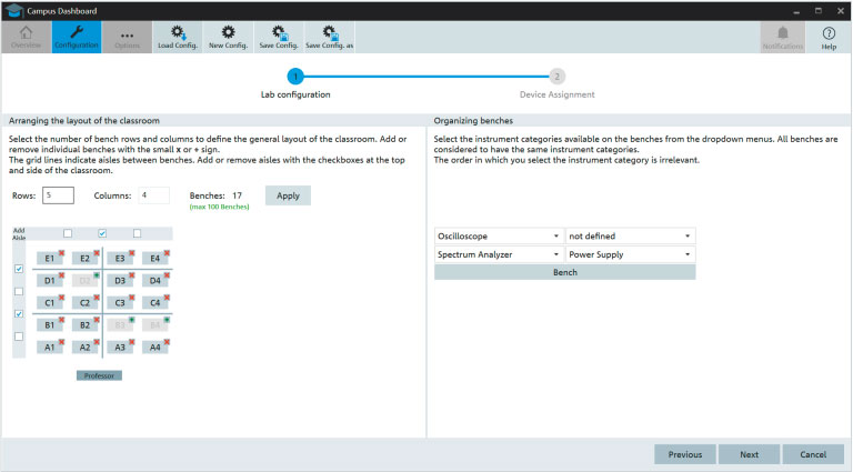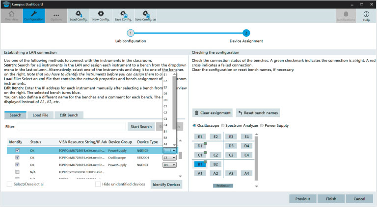 Grouping several instruments into multiple virtual benches gives a clear overview of the laboratory in the software interface, including the status of each individual instrument. An automated search detects all supported instruments in the local network. Alternatively, an .xml list of individual instruments can be loaded into the software. Custom bench layouts match the software with the actual lab arrangement.