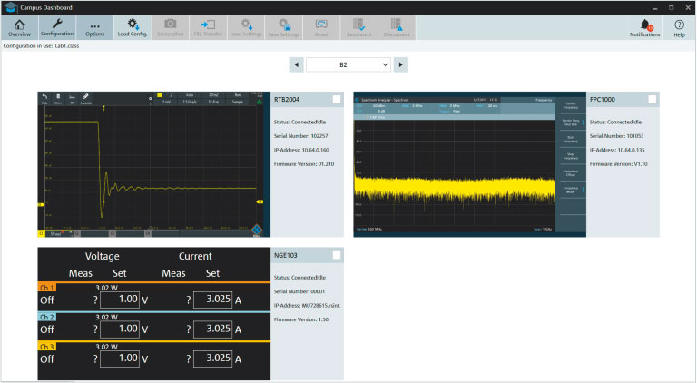 View all instruments on one bench on your computer screen using the R&S CDS campus dashboard software; the software also supports remote control of each instrument