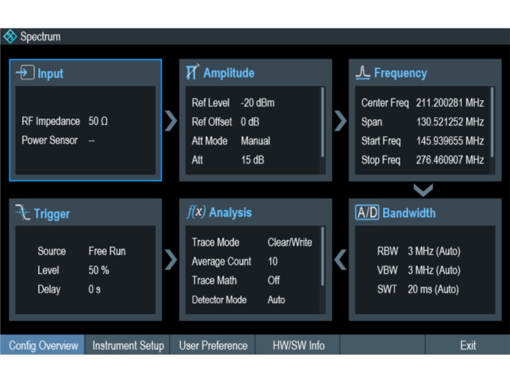 The configuration overview menu makes it easy for the user to get an overview of the main measurement settings. It shows the flow of spectrum measurements at different receiver stages, along with the relevant parameters that impact the measurements at each stage.