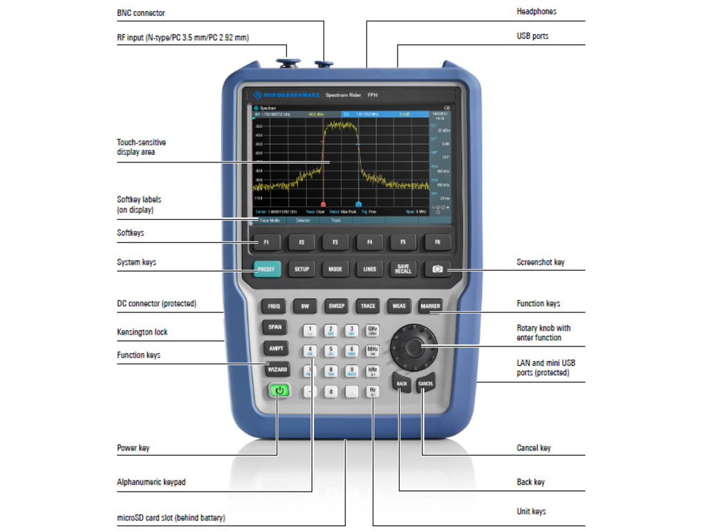 The R&S SpectrumRider FPH offers flexible and straightforward operation. Depending on the application, it can be operated either via its 7" capacitive touchscreen or with keys.