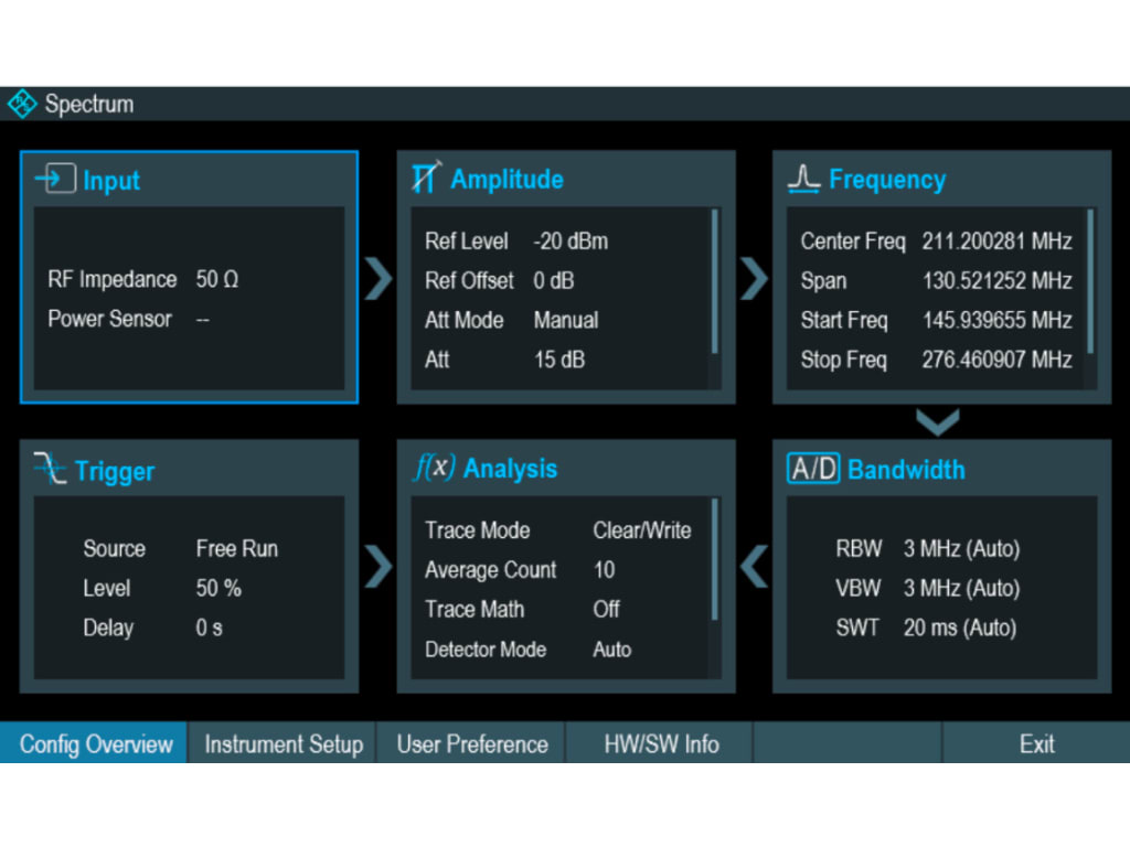 The configuration overview menu makes it easy for the user to get an overview of the main measurement set¬tings. It shows the flow of spectrum measurements at dif¬ferent receiver stages, along with the relevant parameters that impact the measurements at each stage.