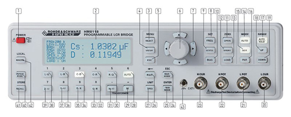 The HM8118 LCR bridge offers a wide measuring frequency range (20 Hz to 200 kHz) and variable measuring voltage (0.10 to 1.50 Vrms). Additionally, it has a bias function for voltage (0 to 5.00 V and 0 to 40 V ext.) and current (0 to 200 mA). The multi-slope conversion technology and the sophisticated generation of the measuring signal allow stable capacitor measurements down to 1 femto farad (resolution 0.01 fF) and inductors down to 0.1 nH (resolution 0.01 nH). All settings and measurements can be operated manually by the front panel controls and may also be remote controlled via the built-in, galvanically isolated, dual interface (USB and RS232) or with the optional IEEE-488 (GPIB) interface (HO880).