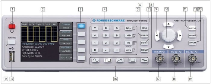 10. Rotary knob - Knob to adjust the values / confirm settings by pushing the knob 11. OUTPUT - Turn on/off the output 12. OFFSET - Add a user defined DC voltage to the signal output 13. INVERT - Inverses the pulse signal output 14. REM/TRIG - Toggling between front panel and remote operation or force trigger 15. USB stick port - USB port for storing parameters and load available waveforms 16. Signal functions - Selection of the signal: sine wave, square wave, triangle, pulse, arbitrary 17. TRIG INPUT (BNC socket) - Input for trigger signals 18. TRIG OUTPUT (BNC socket) - Output for trigger signals (TTL) 19. SIGNAL OUTPUT (BNC socket) - Signal output (50 Ω)