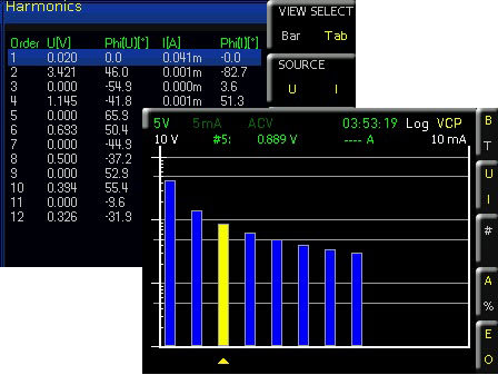 Harmonic analysis can be displayed in a table or graph or even logarithmically for better readability. The bargraph can optionally show up to the 50th harmonic of voltage and/or current. The bargraph shows the amplitude of the harmonic selected with the cursor.