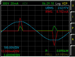 The waveform function shows the voltage, current and power of an input signal period over time. The example shows a load with phase-angle control.