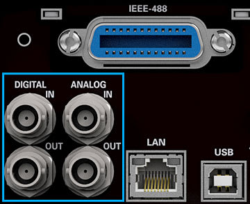 The analog output delivers voltage proportional to the limits (±5 V). Four BNC ports on the rear panel can be assigned to various sources/sinks. The analog output allows users to choose either limits (PASS/FAIL) or measurands U, I or P as a source. The signal at the analog input (±10 V) can be displayed on the screen with 16 bit resolution as well. The digital output can be assigned to the limit (PASS/FAIL) or the measurement frequency used. The signal at the digital input is available as additional information on the display as status (0/1), frequency (up to 200 kHz) or PWM (0 to 100 %). Both inputs are loggable.