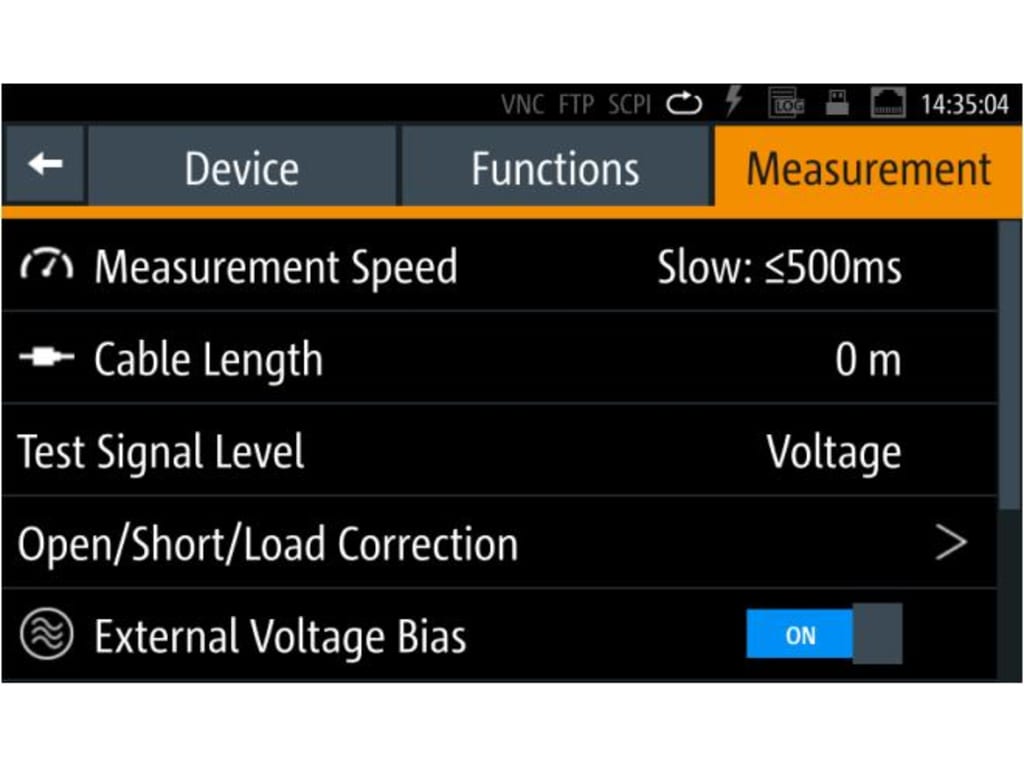 The R&S LCX100 LCR meter covers the frequency range from 4 Hz to 300 kHz. The R&S LCX200 has an upper frequency limit of 500 kHz and can be extended to 1 MHz or 10 MHz using software options when needed. All instruments offer DC measurements as well. Internally generated voltages of up to 10 V cover most applications. Optionally, bias voltages of up to 40 V can be applied externally.