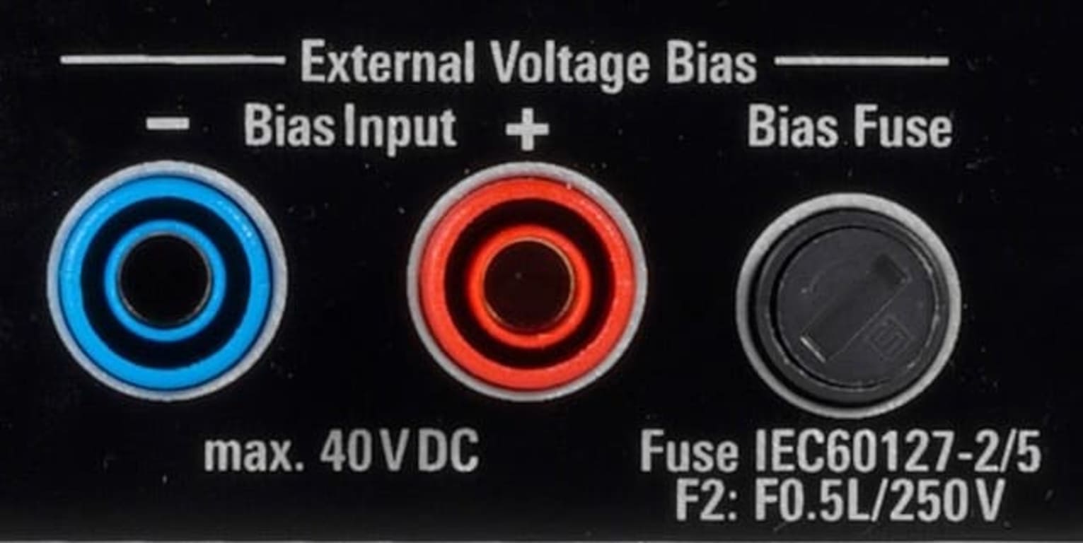 The R&S LCX-K108 option extends the range of applications. On the one hand, this provides a larger voltage range when using the external bias ports on the rear of the LCR meters. Voltages of up to 40 V, e.g. from an external power supply unit, can be applied at the two 4 mm safety sockets. In this case, the current is protected by means of an externally accessible 0.5 A fine-wire fuse.