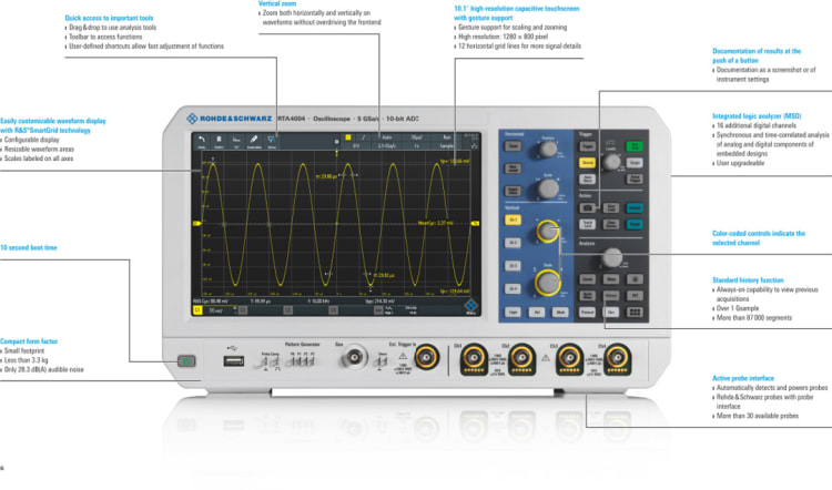 AWG, MSO, I2C, SPI, UART/RS-232/RS-422/RS-485, I2S LJ/RJ/TDM, MIL-1553, ARINC 429, CAN/LIN, power analysis, frequency response analysis, history and segmented memory, spectrum analysis |