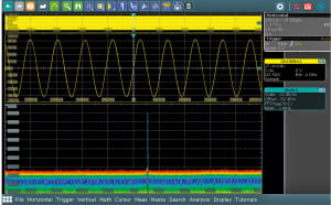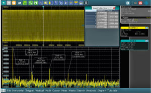 All R&S RTO, R&S RTE, R&S RTM3000 and R&S Scope Rider oscilloscopes come with powerful multichannel spectrum analysis for up to four signals in parallel. The low-noise frontend and the A/D converter's high effective number of bits provide an outstanding spurious-free dynamic range, so that even weak signals can be identified without difficulty.