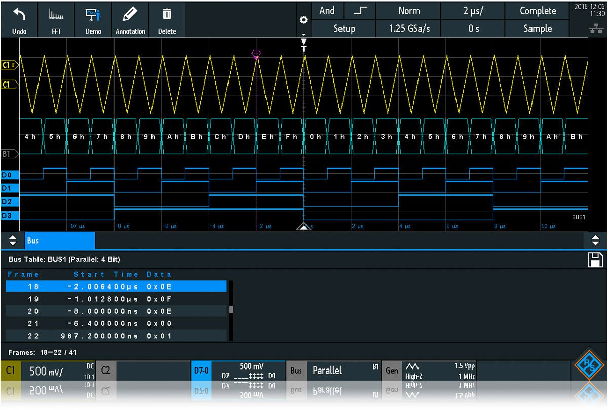 independent of the scope acquisition, the state (stays low, stays high or toggles) of the channels from D15 to D0 is displayed |