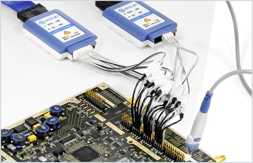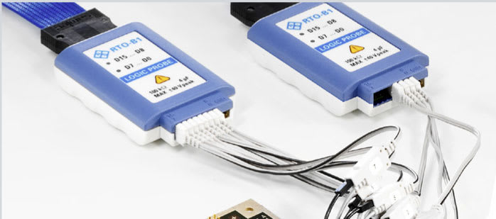 arranged in two logic probes with 8 channels each, assignment of the logic probes to the channels (D0 to D7 or D8 to D15) is displayed on the probe |