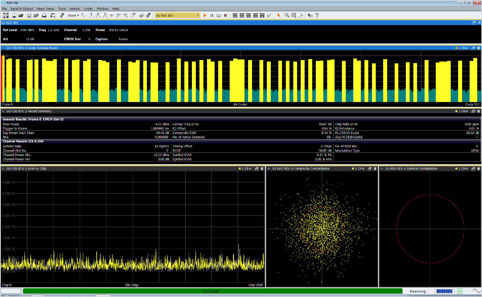The code domain power measurement offers in-depth analysis for a WCDMA signal with several active channels. The composite EVM measurement returns a modulation error value for the total signal. The symbol EVM function yields the individual vector errors of the active channels