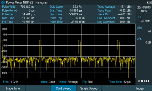 The R&S ZNH-K29 option enables precise pulse and peak power measurements using the ZNH together with a Rohde & Schwarz wideband power sensor. Field applications benefit from this compact, powerful combination. During installation and maintenance of radar systems, pulse characteristics and output power have to be measured. Due to a maximum video bandwidth of 30 MHz and a rise/fall time of < 13 ns, the sensors can measure pulses with a pulse width as short as 50 ns. When installing and maintaining even the latest generation of microwave link modules, the user benefits from the sensor's high measurement speed and wide dynamic range. Automatic pulse analysis helps the user measure important pulse parameters. This analysis eliminates the need for complex measurements using markers. Changes in the pulse shape are immediately taken into account in the measurement results. The following parameters are determined by automatic pulse analysis: