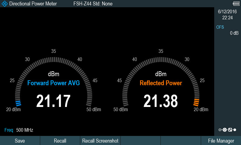 Any high-precision power measurement application, for instance level calibration, requires very high accuracy to measure and align transmitting power. When equipped with the R&S NRPxx power sensors and the R&S ZNH-K9 option, the ZNH becomes an accurate RF power meter with a wide measurement range. Calibration is not required prior to making measurements since the sensors are fully characterized over frequency, level, and temperature and feature long-term stability. Zeroing is usually not required; the user can plug in a sensor and simply start measuring. The R&S FSH-Z14 and FSH-Z44 directional power sensors transform the ZNH into a full-featured directional power meter. The R&S ZNH can then simultaneously measure the output power and the matching of transmitter system antennas under operating conditions. The power sensors measure average power up to 120 W and eliminate the need for extra attenuators. In addition, the peak envelope power (PEP) can be determined up to 300 W. A common application is the combined monitoring of the transmitter output and antenna reflected power of critical systems. Power measurements may also include optical power measurements. Testing optical transport networks (OTN) during base station installation and maintenance is a prime example. The R&S HA-Z360/-Z361 optical power meters connect to the R&S ZNH USB port and visualize optical absolute power in dBm as well as relative power in dB on the instrument.