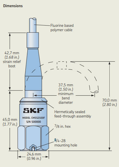 The CMSS 2100F accelerometer is a good multi-purpose sensor with integral cable for light to medium-duty applications in the following industries: automation, food and beverage, pulp and paper, water and waste-water. Common applications include general purpose machines such as pumps, motors, and fans.