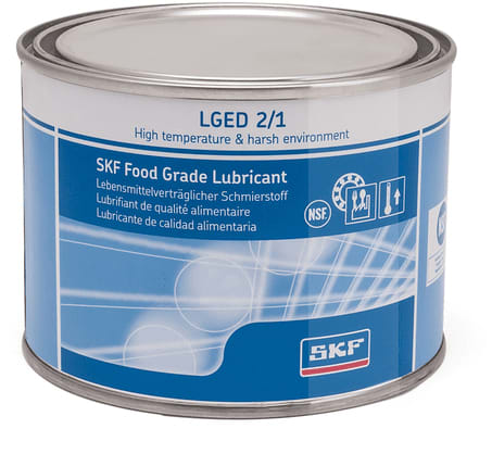 SKF LGED 2 is a food grade NSF H1 certified grease based on a synthetic fluorinated oil using a PTFE thickener. It is suitable for extremely high temperature from 180 °C (392 °F) up to 240 °C (464 °F) and/or aggressive environments such as acids/alkalis, vacuum, oxygen etc.