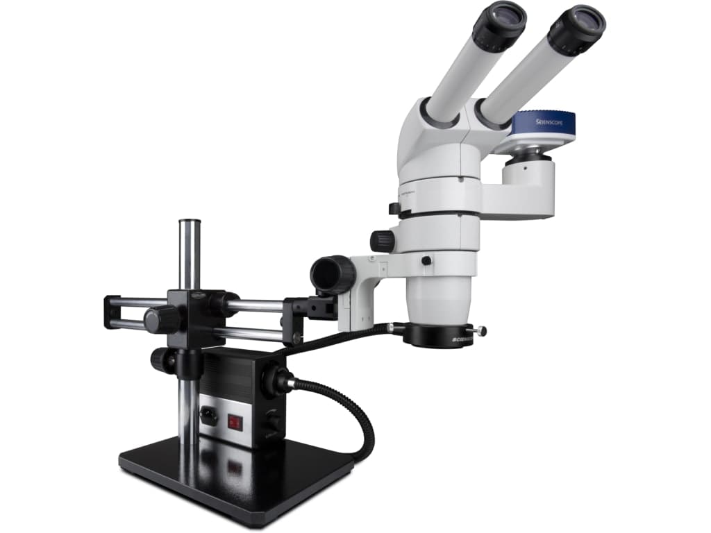 The Scienscope "E" series is a parallel zoom microscope system, available in both binocular and trinocular formats. The "E" series comes standard with high performance optics, and is presented in a modular format, enabling users to configure a system to best suit their application. Magnification, field of view and working distance can vary greatly through different combinations of eyepieces, zoom bodies and objectives, offering a high level of flexibility in one system. Please see the Specifications tab for detailed performance data. Scienscope offers over 30 different "E" series packages. Users can select from binocular and trinocular systems, 20° fixed or 0-45° tilting heads, as well as a variety of stands and light sources. To see a complete listing of binocular and trinocular packages and what is included with each, please see the links below: