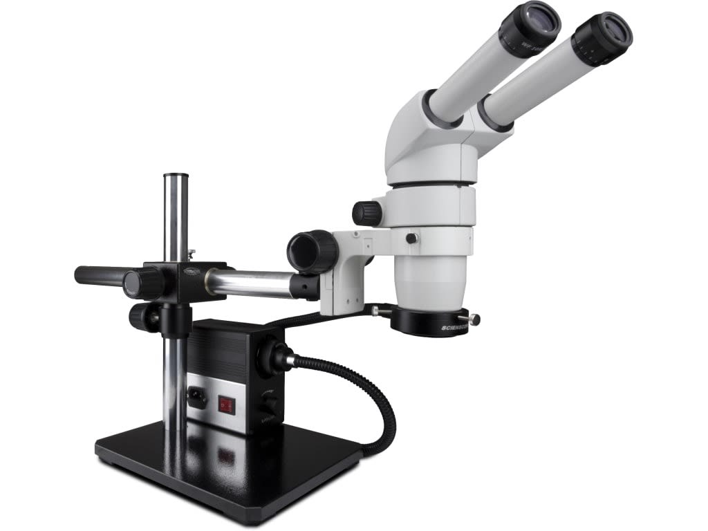 E-Series 20 Degrees Binocular Head with 10x Eyepieces (Pair), 1:6 Zoom Body (0.8x-5x), 0.5x Achromatic objective Lens, LED illuminator, Fiber optic annular ring light, 76mm focus mount, and single arm boom stand.