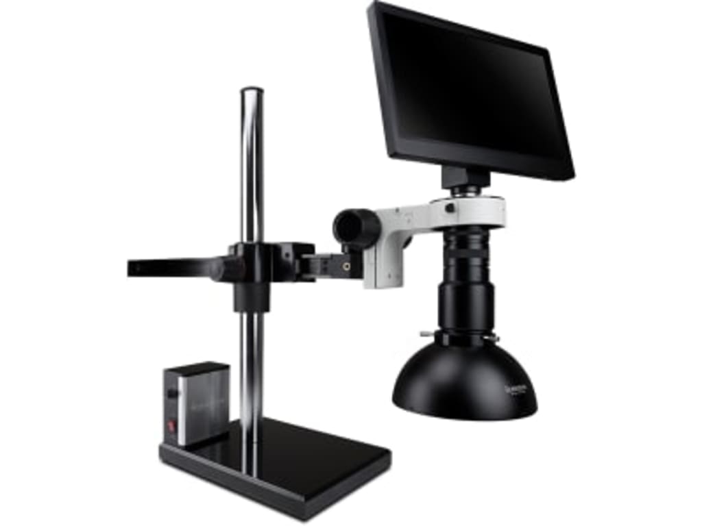 MACRO video zoom optics (up to 40x magnification with 8 inch working distance) on gliding arm boom stand, 1080p HD camera and 12 inch LCD monitor combination with diffused LED dome light (IL-LED-R2D). All systems include camera/monitor combo with 8GB SD card, wireless mouse, USB cable, power supply, and image capture software.