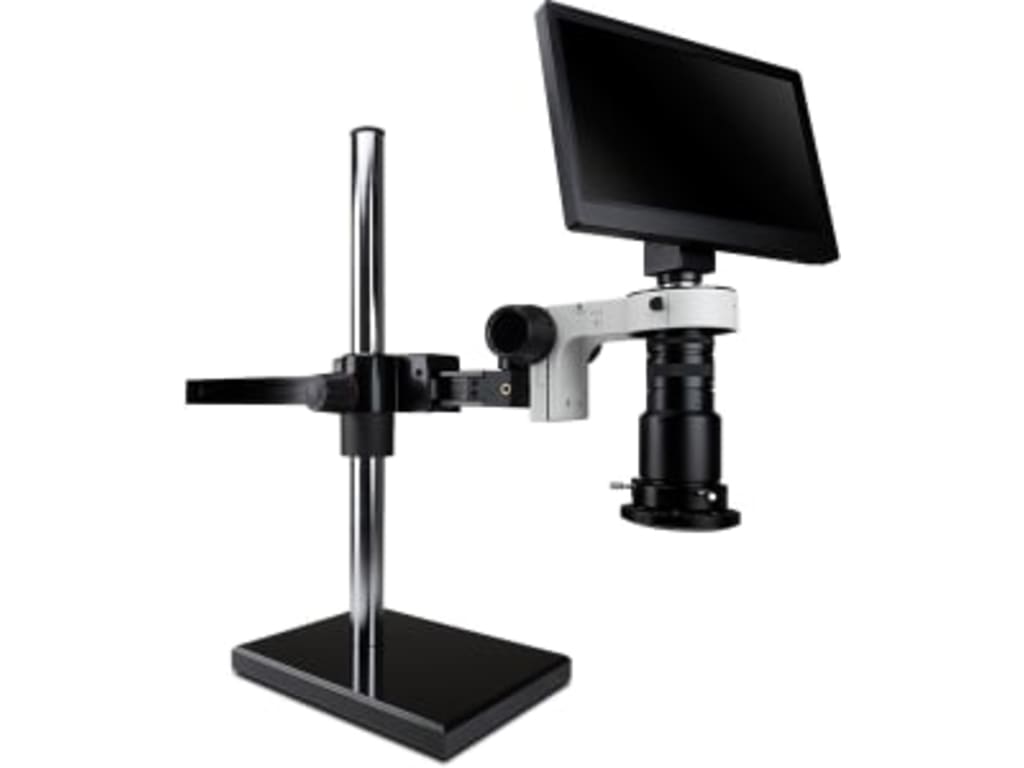 MACRO video zoom optics (up to 40x magnification with 8 inch working distance) on gliding arm boom stand, 1080p HD camera and 12 inch LCD monitor combination withhigh intensity LED ring light with polarizer (IL-LED-R3). All systems include camera/monitor combo with 8GB SD card, wireless mouse, USB cable, power supply, and image capture software.