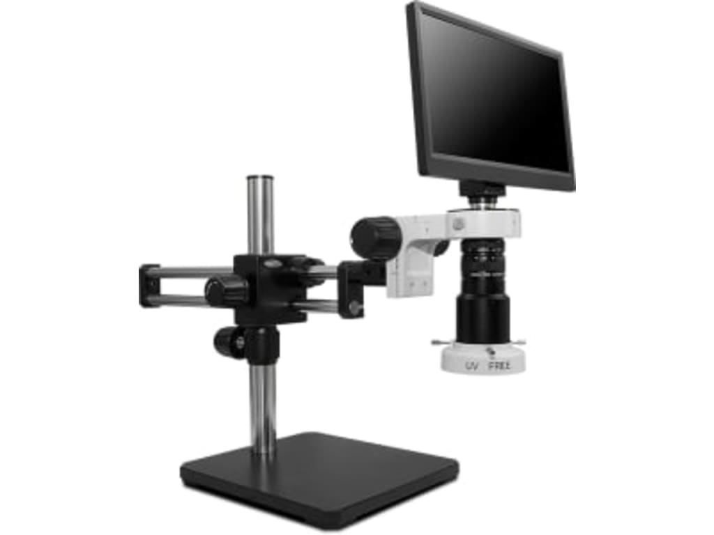 MACRO video zoom optics (up to 40x magnification with 8 inch working distance) on dual arm boom stand, 1080p HD camera and 12 inch LCD monitor combination with diffused compact LED ring light. (IL-LED-E2D). All systems include camera/monitor combo with 8GB SD card, wireless mouse, USB cable, power supply, and image capture software.
