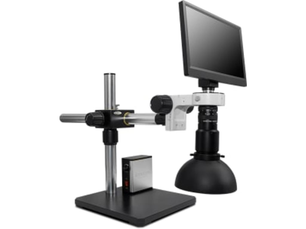 MACRO video zoom optics (up to 40x magnification with 8 inch working distance) on single arm boom stand, 1080p HD camera and 12 inch LCD monitor combination with diffused LED dome light. All systems include camera/monitor combo with 8GB SD card, wireless mouse, USB cable, power supply, and image capture software.