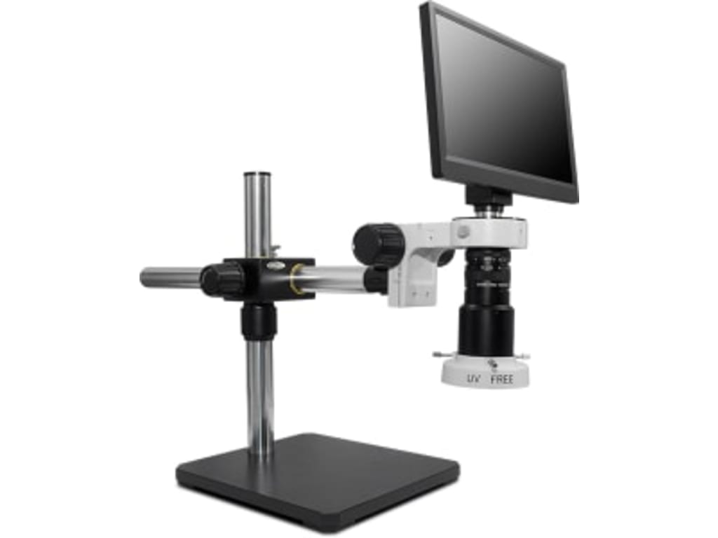 MACRO video zoom optics (up to 40x magnification with 8 inch working distance) on single arm boom stand, 1080p HD camera and 12 inch LCD monitor combination with diffused compact LED ring light. (IL-LED-E2D). All systems include camera/monitor combo with 8GB SD card, wireless mouse, USB cable, power supply, and image capture software.