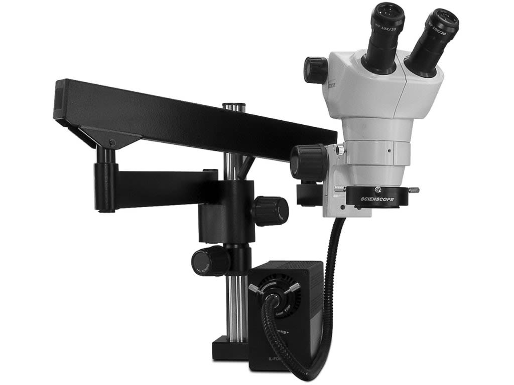 Binocular Microscope with Heavy Duty Articulating Arm, LED Fiber Optic Illuminator and Ring Light
