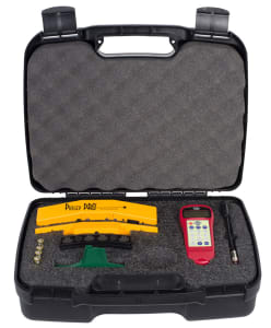 The PULLEY PARTNER laser pulley alignment system is light-weight, compact and durable. The unit magnetically attaches to the inside or outside face of any pulley or sprocket and has no small parts or targets that can get lost. We use our proven reflected laser beam technology for maximum angular resolution, thus providing you with the most reliable and accurate readings that no other method or tool can match. The PULLEY PARTNER can measure spans up to 6 ft. (1.9 m) or better with ANY size pulley, large or small. A laser line is projected from the PULLEY PARTNER transmitter to the reflector mounted on the opposite pulley. A reference line on the reflector indicates offset and vertical angle misalignment immediately. The laser line is then automatically reflected back to the transmitter’s reference line to show horizontal angle misalignment. This ensures all major aspects of pulley misalignment are resolved. This tool is so easy to use, a single operator can perform the alignment task in minutes with no training! Comes in its own durable carrying case.