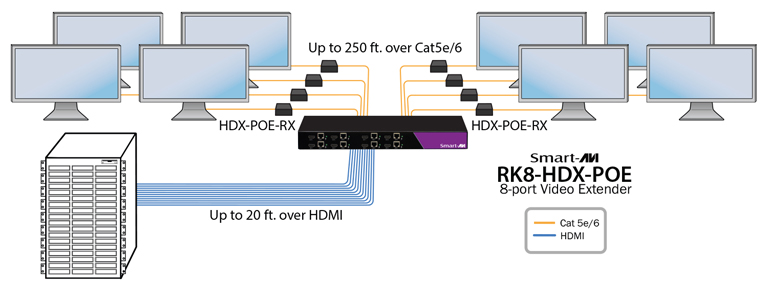 8-Port Rackmount HDBaseT HDMI and IR Extender Transmitter over a Single Cat5/5e/6 Cable. Includes: [RK8- HDXPOE-TX, CCWPWR]