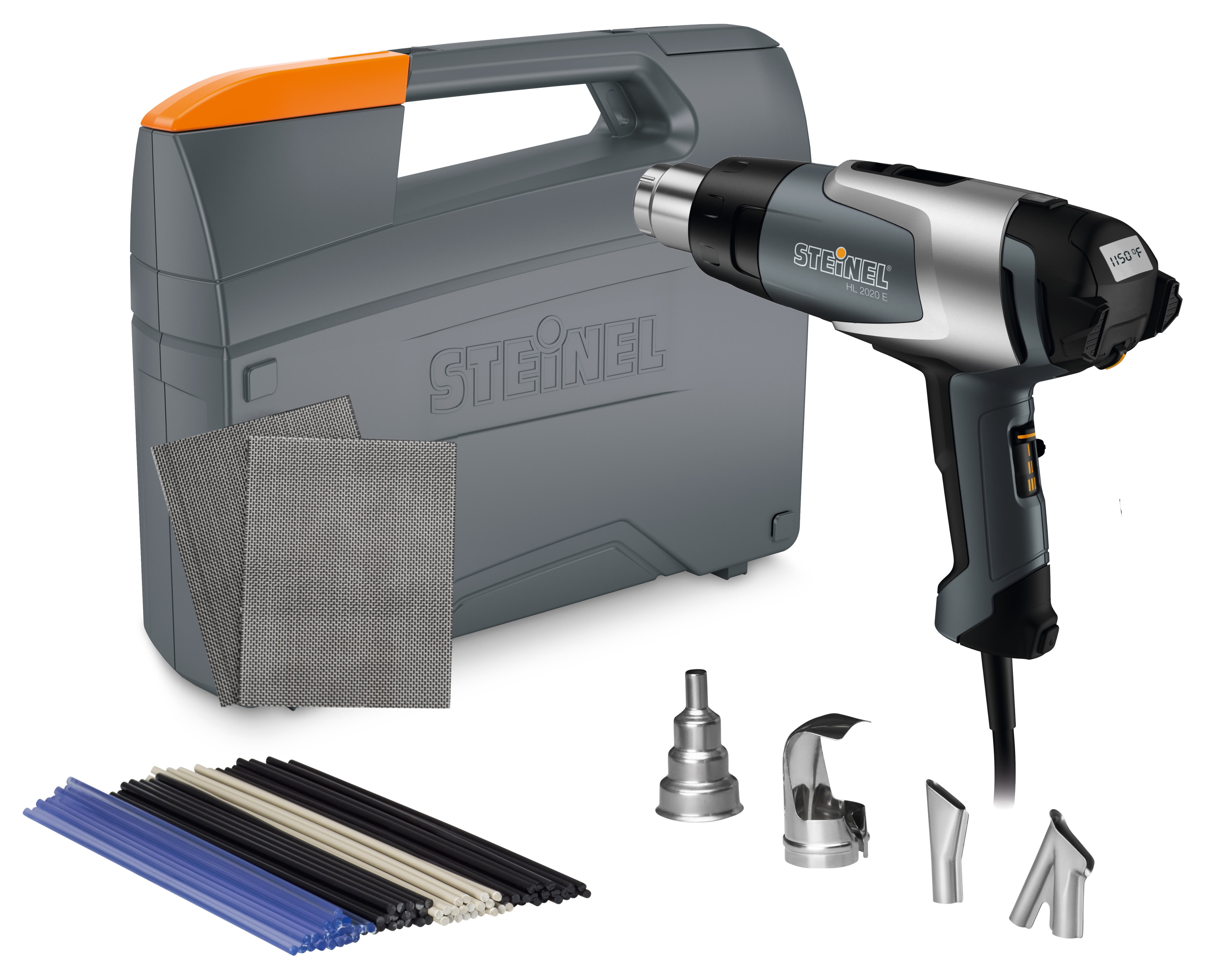 These all contain the Steinel HL2020E heat tool, but are available in packages made for specific applications. The list below provides an overview of each. • HL2020E - Heat tool, Catalog # 110025597 • HL2020E Heat Tool • HL2020E CASE - Heat tool with case, Catalog # 110052747 • HL2020E Heat Tool • Heavy Duty Carrying Case • HL2020E AUTO TEMP - Automotive Kit with Temperature Scanner, Catalog # 110051550 • HL 2020 E Heat Tool • HL Scan • Reflector Nozzle 14mm • Reflector Nozzle 39mm • Reduction Nozzle 9mm • Reduction Nozzle 20mm • Window Nozzle 75mm • Welding Nozzle • PP Plastic Welding Rods • Plastic Welding Book • Auto Body Welding DVD • Catalog • Heavy Duty Carrying Case • HL2020E AUTO - Automotive Kit, Catalog # 110051537 • HL 2020 E Heat Tool • Reflector Nozzle 14mm • Reflector Nozzle 39mm • Reduction Nozzle 9mm • Window Nozzle 75mm • Welding Nozzle • PP Plastic Welding Rods • Plastic Welding Book • Auto Body Welding DVD • Catalog • Heavy Duty Carrying Case • HL2020E PLASTIC - Plastic Welding Kit, Catalog # 110051538 • HL 2020 E Heat Tool • Welding Nozzle • Lap Welding Slit Nozzle 20mm • Reduction Nozzle 9mm • Reflector Nozzle 39mm • 2 pcs Wire Mesh • Plastic Welding Rod Assortment • Plastic Welding Booklet • Catalog • Heavy Duty Carrying Case • HL2020E SILVER - Silver Anniversary Kit, Catalog # 110051541 • HL 2020 E Heat Tool • Spreader Nozzle 75mm • Reflector Nozzle 14mm • Reflector Nozzle 39mm • Reduction Nozzle 9mm • Welding Nozzle • Plastic Welding Rod Assortment • Shrink Tubes • Plastic Welding Booklet • Catalog • Silver Case • HL2020E PLATINUM - Platinum Kit, Catalog # 110051542 • HL 2020 E Heat Tool • Spreader Nozzle 75mm • Reflector Nozzle 14mm • Reflector Nozzle 39mm • Reduction Nozzle 9mm • Shrink Tubes • Catalog • Silver Case • HL2020E MULTI - Multi Purpose Kit, Catalog # 110051539 • HL 2020 E Heat Tool • Reflector Nozzle 9mm • Reflector Nozzle 14mm • Reflector Nozzle 39mm • Reduction Nozzle 9mm • Welding Nozzle • Plastic Welding Rod Assortment • Plastic Welding Booklet • Catalog • Heavy Duty Case