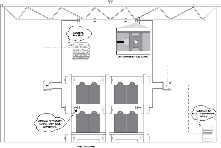 The SBS-H2 Hydrogen Detector is a complete hydrogen monitoring system with visual and audible alarms. The system comes complete with the main display, a highly accurate hydrogen gas sensor, and a 25-ft. cable. Lead-acid storage batteries emit hydrogen gas while discharging and recharging. Hydrogen concentrations of 4% to 75% by volume in the air are potentially explosive. The SBS hydrogen gas detector is designed to allow dissipation and give warning before any concentration reaches the lower explosive limit (LEL) of 4%. This unit is easy to install and very cost-effective. Includes hydrogen specific sensor for detection and monitoring of H2 gas and relays for remote connection to alarm/monitoring systems and for control of external relays or an exhaust fan. This device can be used to meet the minimum requirements for your battery room to be in compliance with IEEE Std 484-2002, National Fire Protection Agency (NFPA) Article 64, and Uniform Building Code (UBC) Sect 6400. Failure to monitor hydrogen gas production and alarm when certain thresholds are reached can void your insurance policy and exposes your company to severe risk should any injury result from a non-passive hydrogen gassing event.