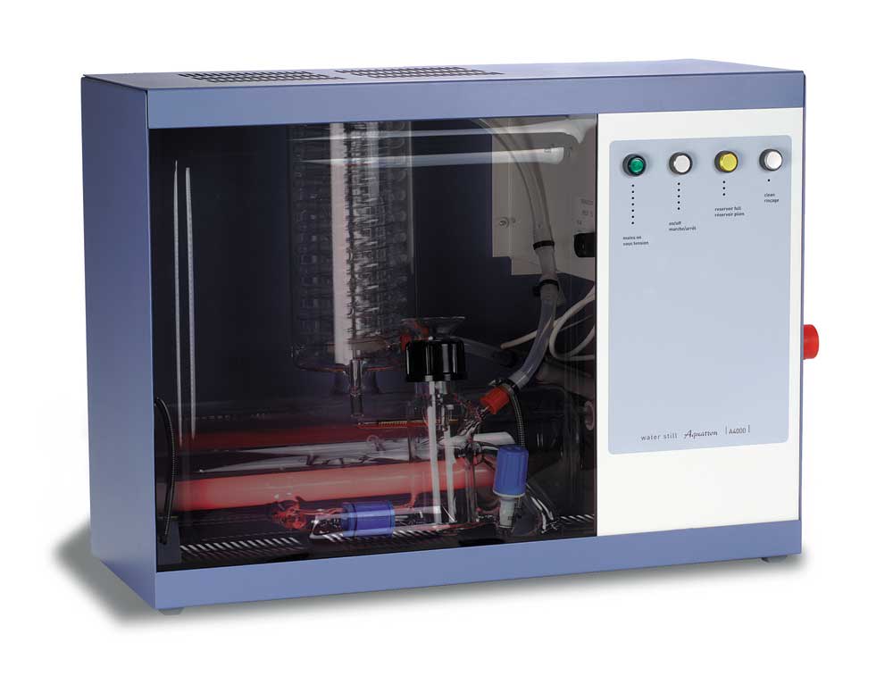 Three models are available giving outputs of 4 or 8 litres/hour single or 4 litres/hour double distilled water. The high quality PYREX® borosilicate glassware coupled with silica sheathed heaters gives pyrogen free distillate of the highest purity from virtually any raw water supply. The unique condenser design ensures that the droplets of distilled water remain in contact with the cooling coil for the longest possible time ensuring maximum energy transfer. This produces cold distilled water ready for immediate use and pre-heats the boiler feed to increase efficiency. All glass construction allows rapid descaling using strong mineral acids. A built in "clean" function and integral acid addition funnel make the cleaning operation simple and safe with no need to dismantle any of the glassware. A large bore ROTAFLO® stopcock with PTFE key is fitted for easy draining of chemicals after cleaning. A flow sensing device will detect any reduction in the flow of cooling water to below the required level and will turn off the still before it can overheat. Sensing the flow of cooling water rather than its pressure is safer and allows the still to run normally on low pressure supplies down to 3psi (20kPa). As a fail-safe device there is an over-temperature thermostat mounted in the boiling chamber. The Aquatron is very easy and safe to assemble and maintain. Both the acrylic safety screen and the cabinet lid are removable giving unrivalled access to the glassware components. Screwthreads are incorporated on all water connections so hoses can be fitted and removed easily and safely without risk of breakage. Every Aquatron® water still is supplied with a reservoir level control. The control is a simple and effective system which can be fitted to virtually any type of reservoir vessel. It will turn the still off when the reservoir is full and restart it when the level in the reservoir drops as distilled water is removed for use making it fully automatic. water purification
