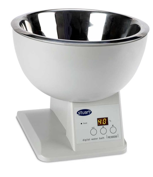 Digital baths These attractive water baths are specifically designed to be used with the Stuart rotary evaporators to give maximum efficiency for the smallest footprint. The clear LED digital shows the actual bath temperature or the set temperature. The RE300DB is suitable for lower temperature applications whereby the RE300OB is can be used with oil for higher temperature evaporations. Outer case's are made from chemically resistant polypropylene.